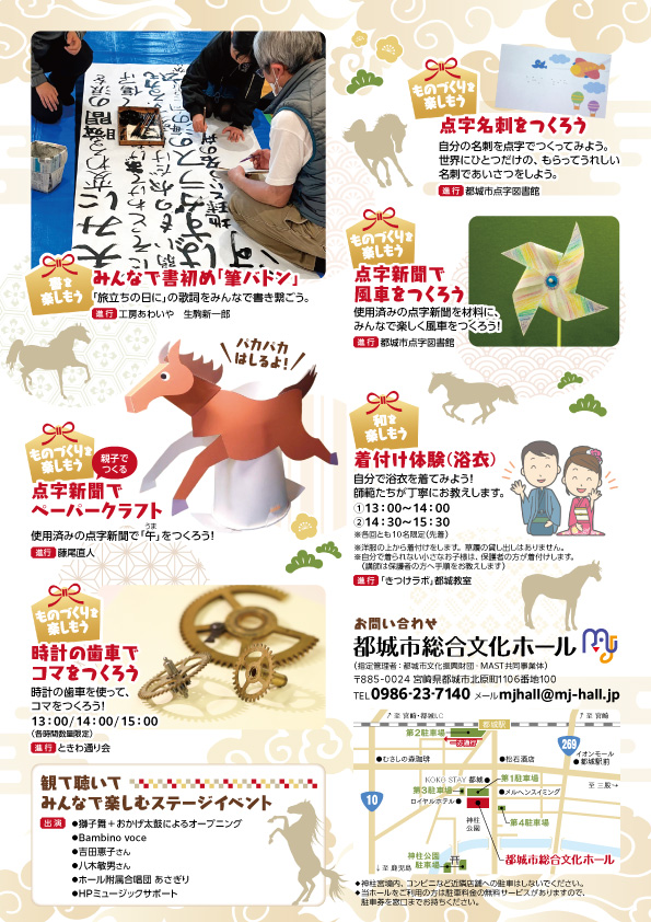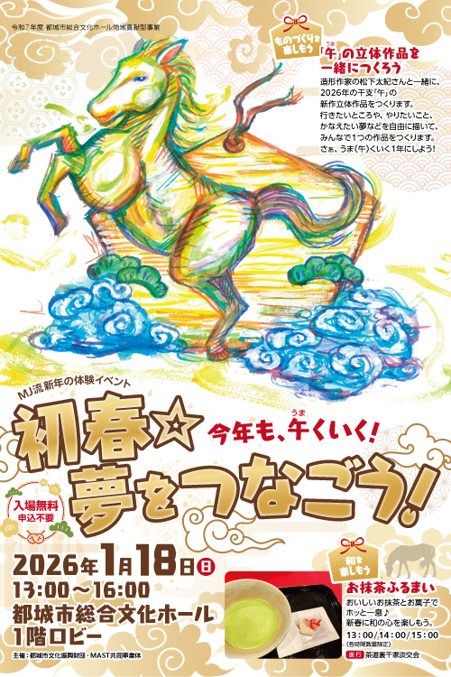 MJ流新年の体験イベント。2026年の干支「午」の立体作品づくりや書き初め、着付け、点字名刺づくりなど、さまざまな楽しい体験ができます。さらにお抹茶のふるまいも。